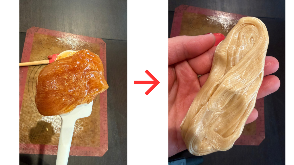 引き伸ばしが足りないと、べっこう飴のような色になってしまいます。引き延ばして折りたたむ作業は、白くなるまでしっかり行います。