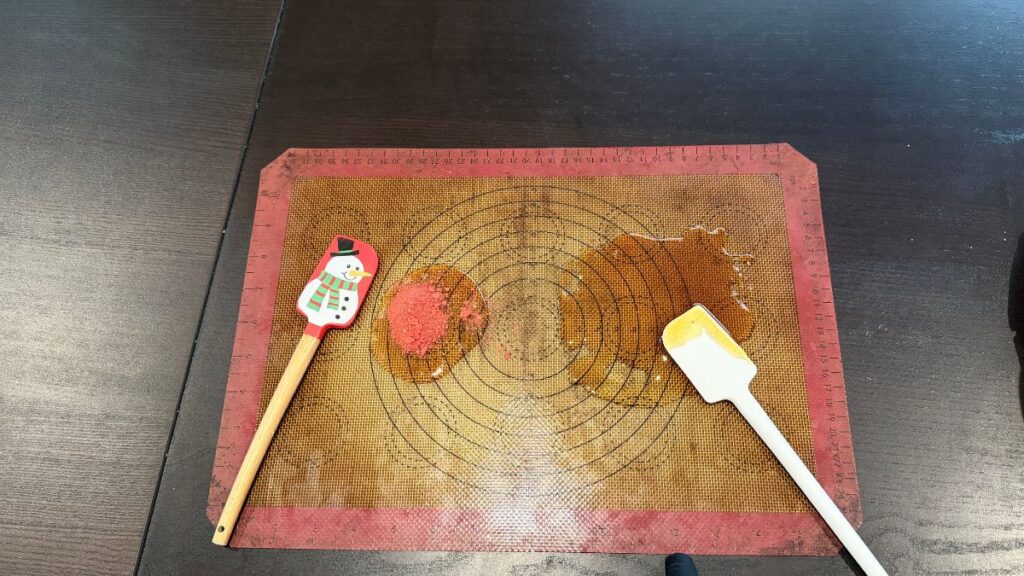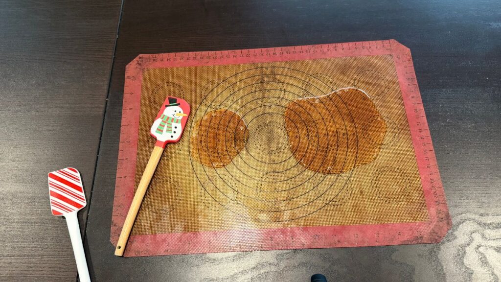 オーブンシートを使用したり、ステンレスのバットを利用してみました。どれも飴がひっついて大失敗でした。シリコンマットが一番良いです。