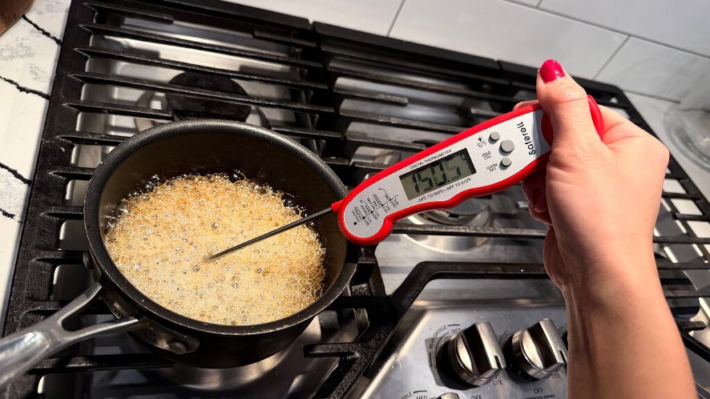 火傷に注意! 煮詰めた飴は150℃を超える高温になります。とても熱いので扱いには十分に気をつけてください。